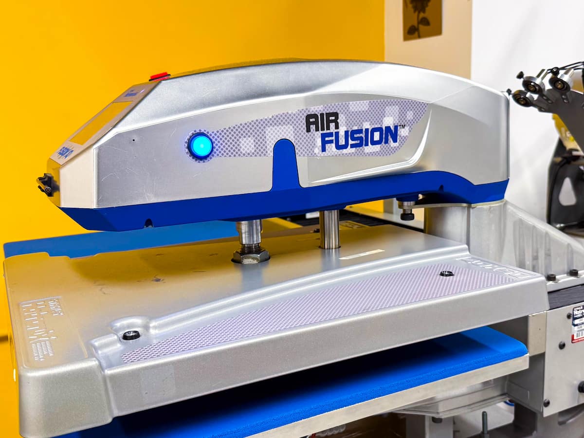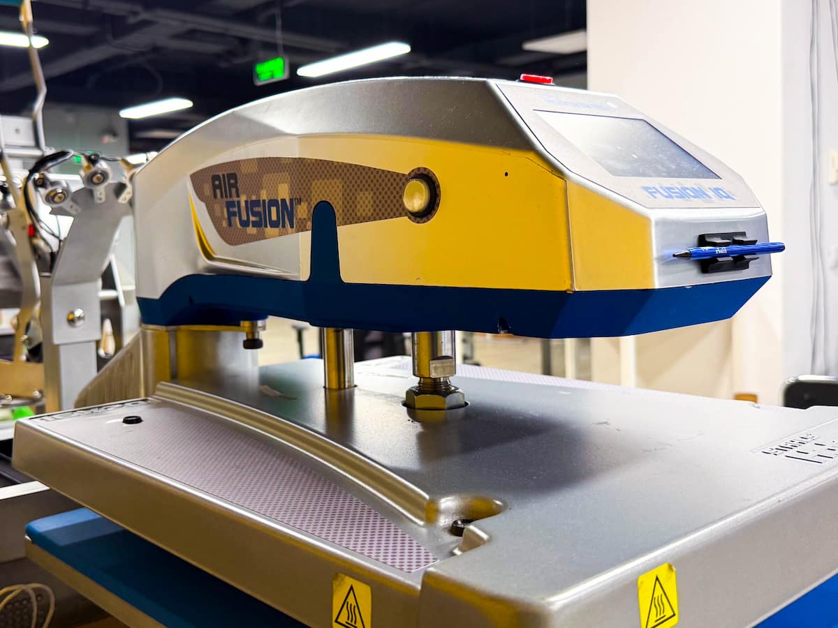 Presa termică aplică căldura și presiunea necesare pentru ca adezivul din spatele foliei să se activeze și să creeze o legătură permanentă cu țesătura.