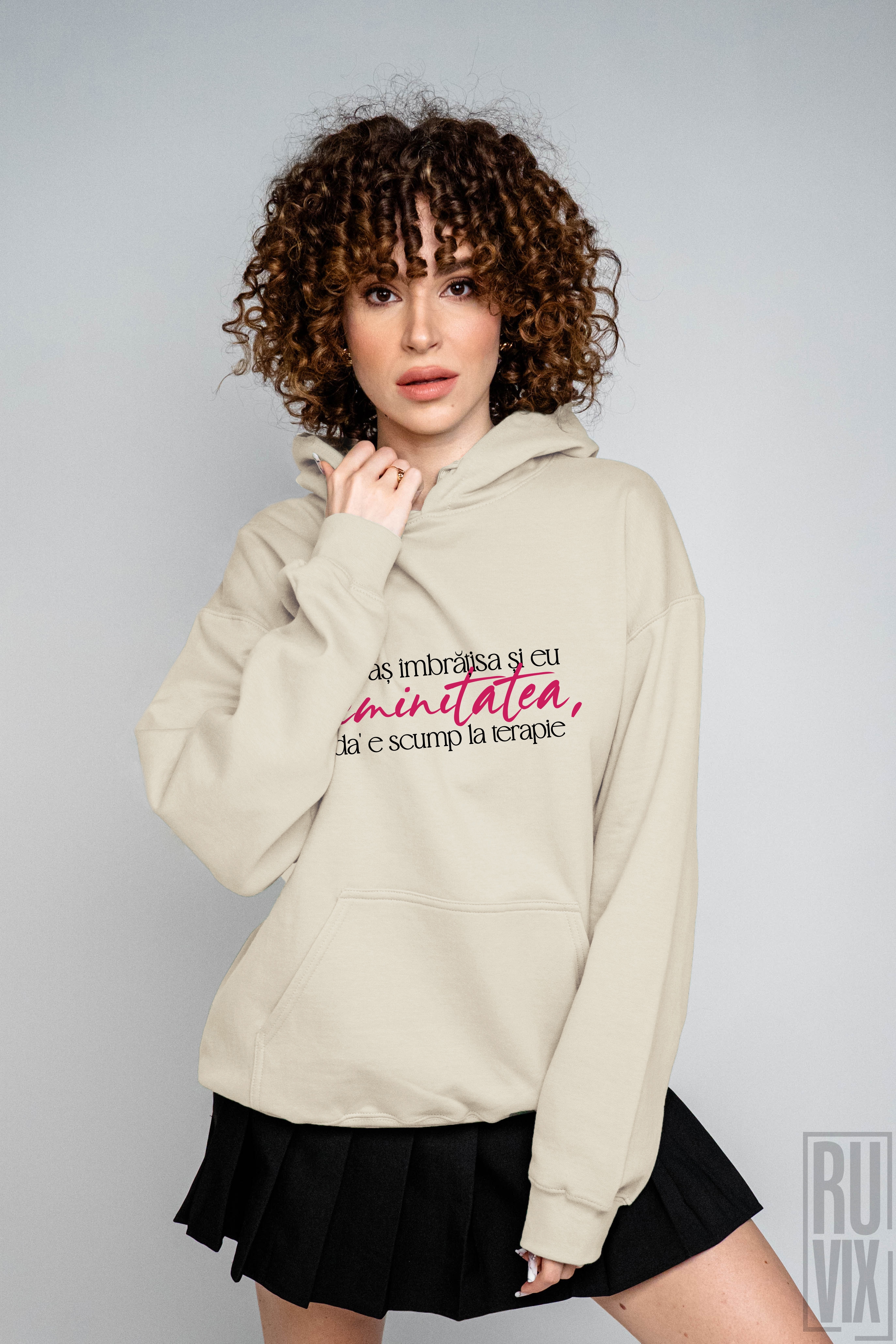 Hanoracul „Îmbrățișarea feminității” este pentru cele care tratează cu autoironie procesul descoperirii de sine. Acest hanorac combină umorul, nostalgia și confortul.