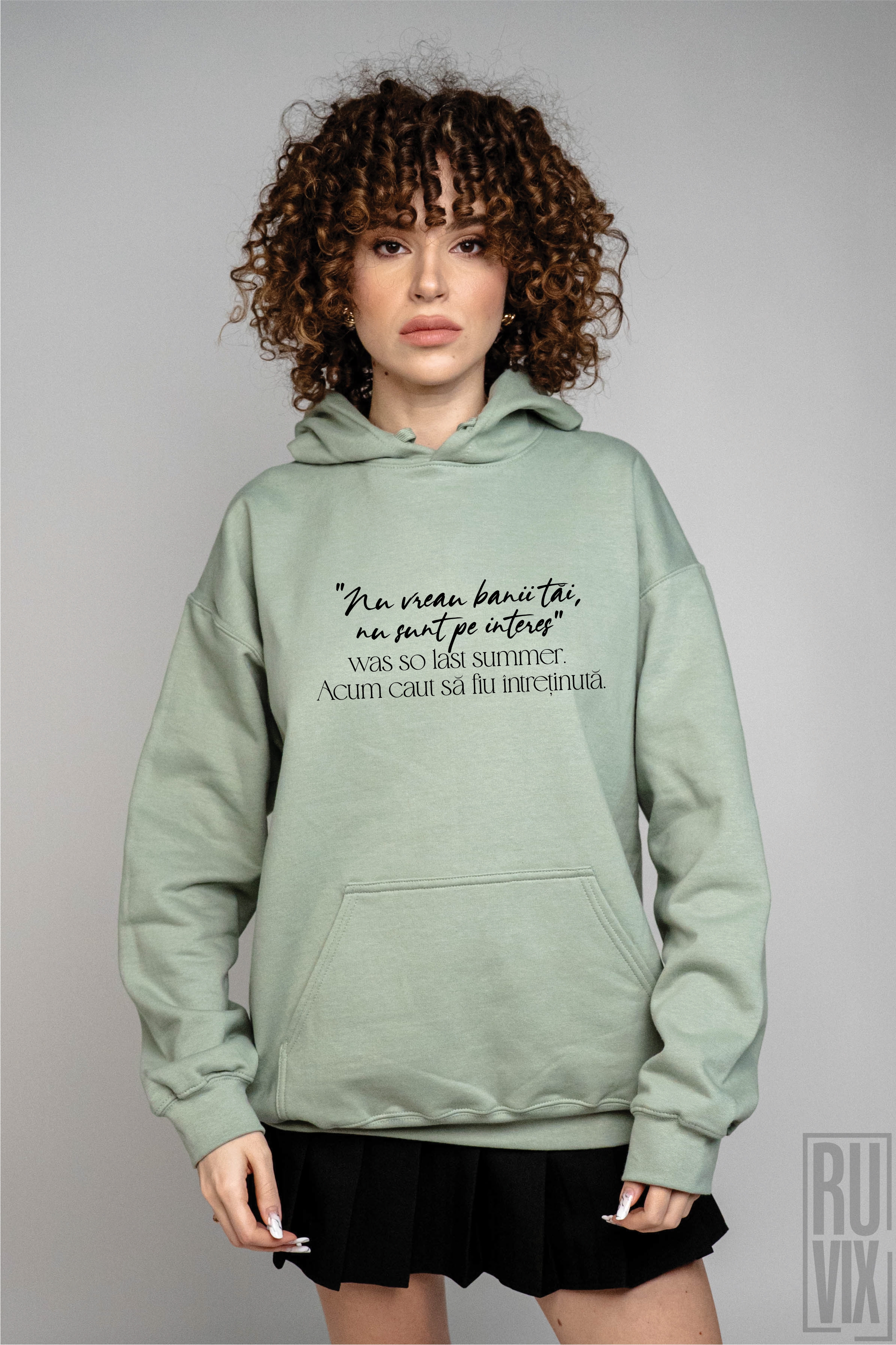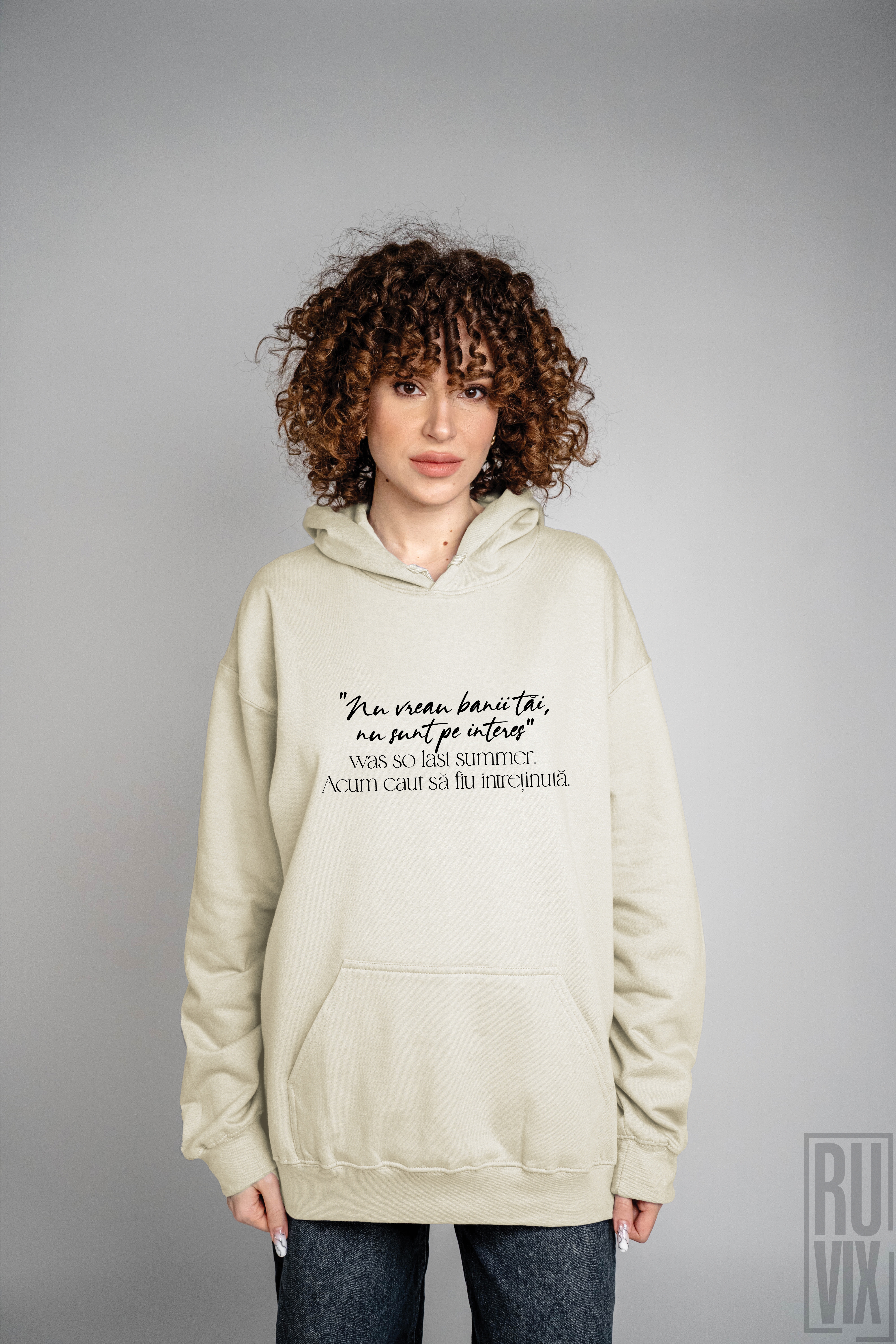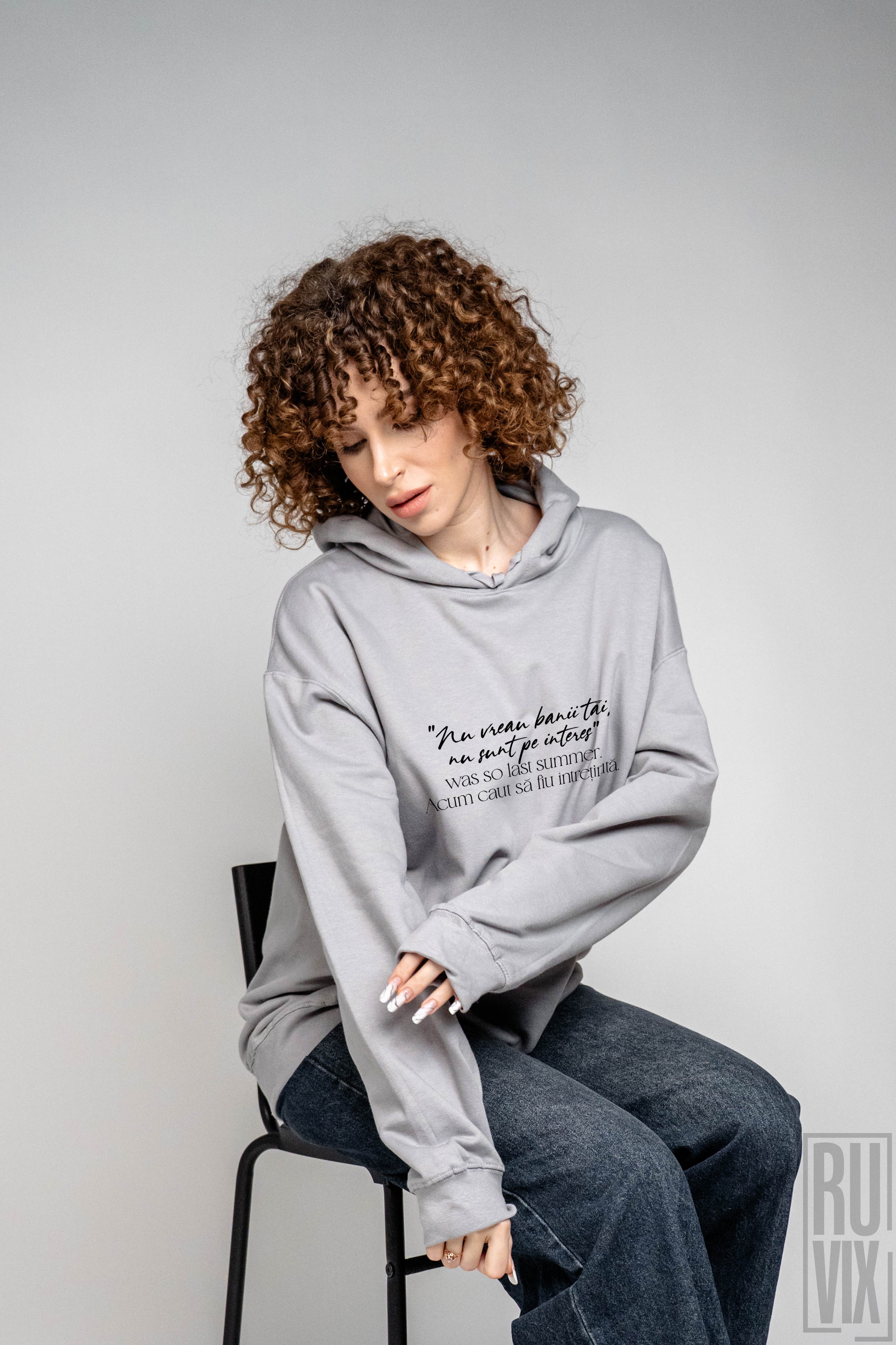 Hanoracul „Nu sunt pe interes” e pentru femeile care știu ce vor. Inspirat din versurile care ne-au marcat adolescența, acest hanorac combină umorul, nostalgia și confortul.